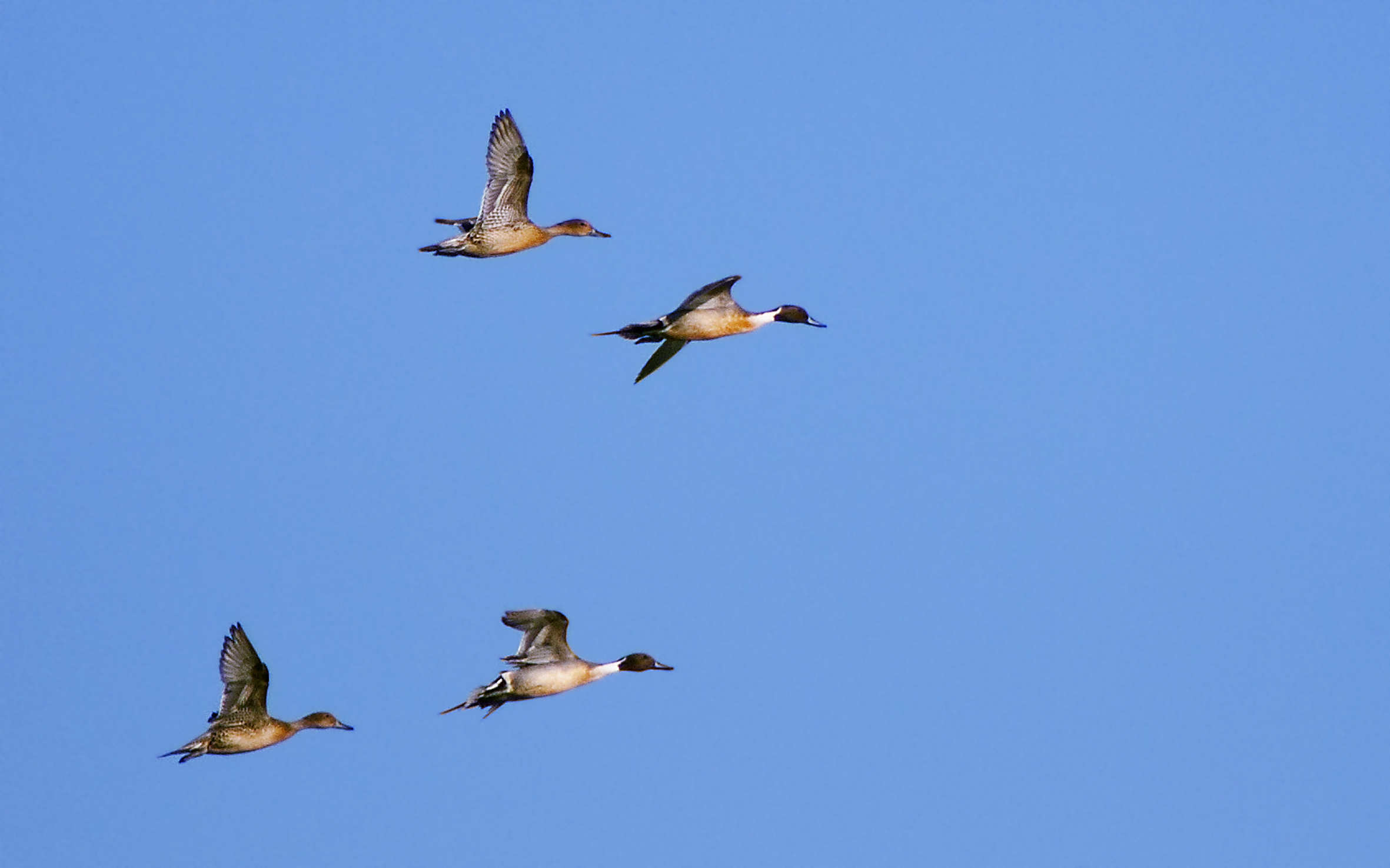 Pijlstaarten (Anas acuta) boven de Beusichemse Waard. De pijlstaart is, zoals op de foto te zien valt, een buitengewoon slanke, elegante en fraaigetekende eend...