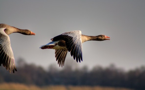 Rondje om het Naardermeer gefietst, ons oudste natuurgebied. Een frisse, prille lentedag waarop de zon uitbundig scheen en het met een graad of tien niet echt koud aanvoelde. Zag kuifeendjes, wintertalingen, twee grote zilverreigers, pijlstaarten, kieviten en de eerste grutto’s. Allemaal helaas veel te ver weg voor een goede foto. Alleen deze grauwe ganzen waren zo vriendelijk even vlak langs mijn lens te vliegen.