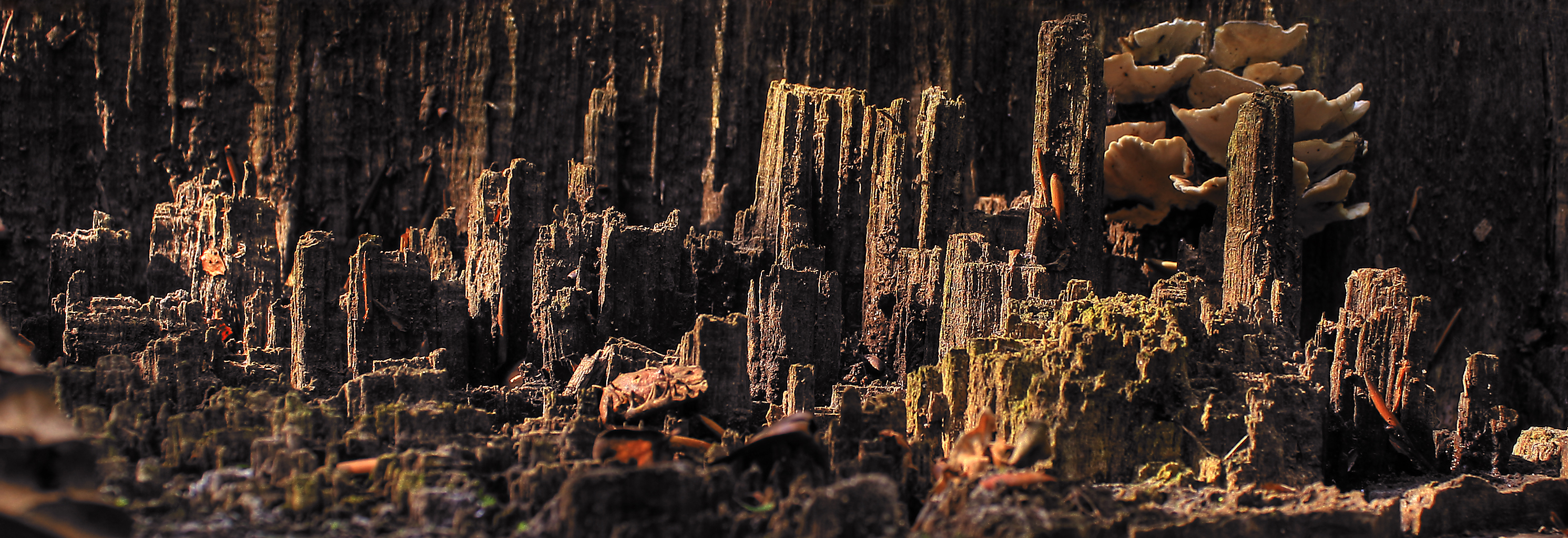 Soms ontdek je in de natuur patronen die je aan heel iets anders doen denken. Wie zou in deze rottende boomstam niet de skyline van New York herkennen?