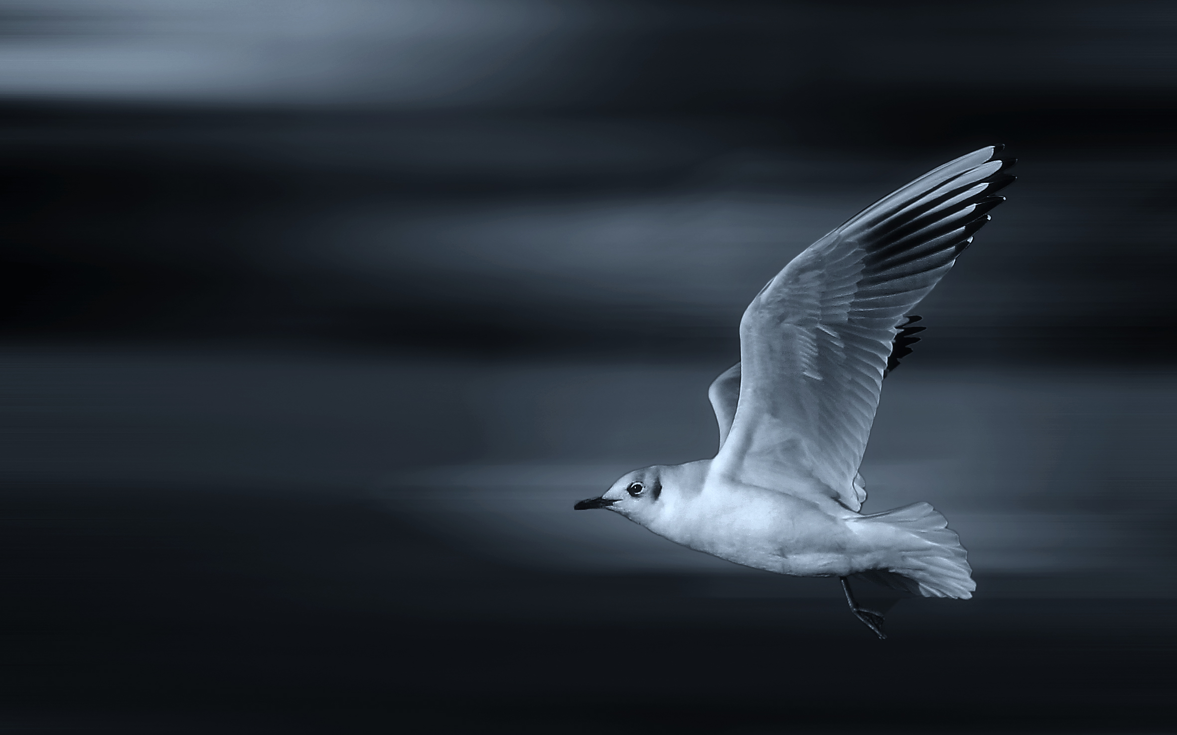 De eerder geüploade foto van deze kokmeeuw bevatte een foutje: de bewegingsvervaging die ik op de achtergrond had toegepast liep niet door tot in de ruimte tussen de handpennen van de rechtervleugel. Vandaar deze reload.