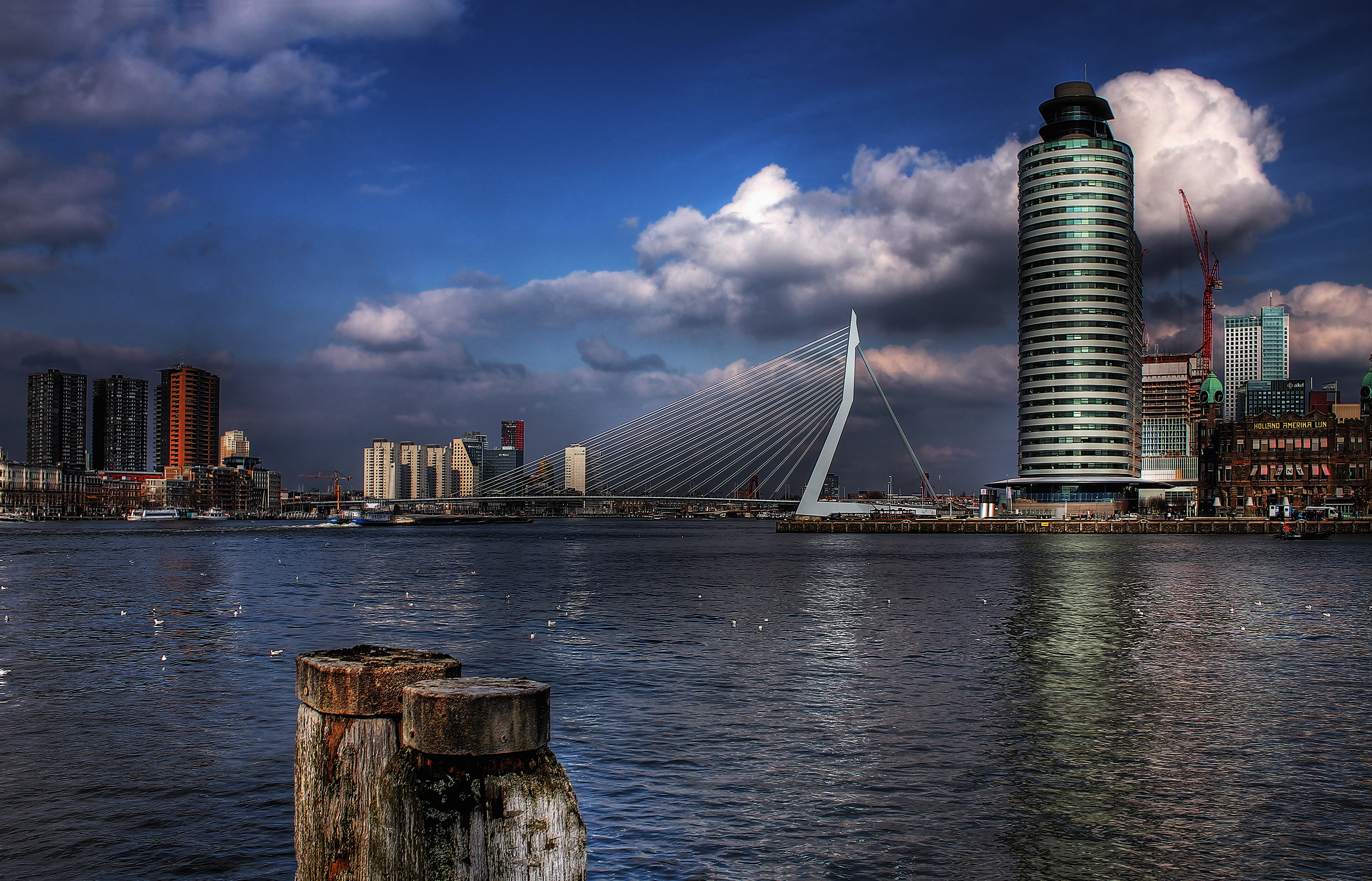 • Het is de Erasmusbrug gezien vanaf Katendrecht. Sinds kort is er een loop- en fietsbrug die de Wilhelminapier met Katendrecht verbindt. Helemaal rechts (even op grotere afbeelding klikken) zie je het Hotel New York. Vanaf dit punt vertrokken de oceaanstomers van de Holland Amerika lijn ooit naar Amerika.