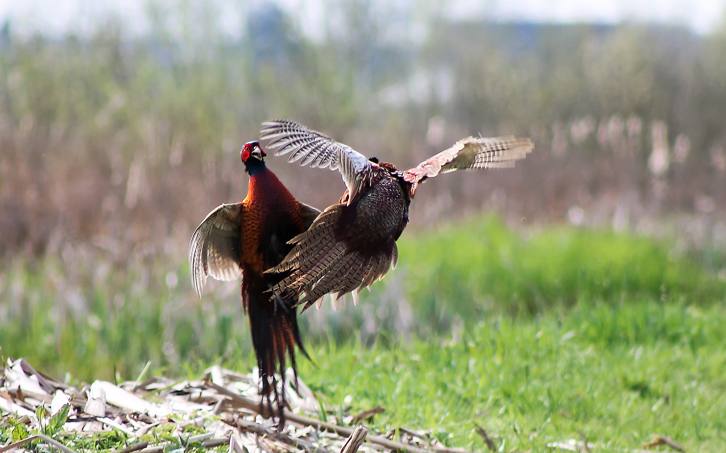 Dit lijkt mij een territoriumgevecht van twee fazantenhaantjes, of zouden ze enkel maar gezellig een beetje aan het ravotten zijn?
