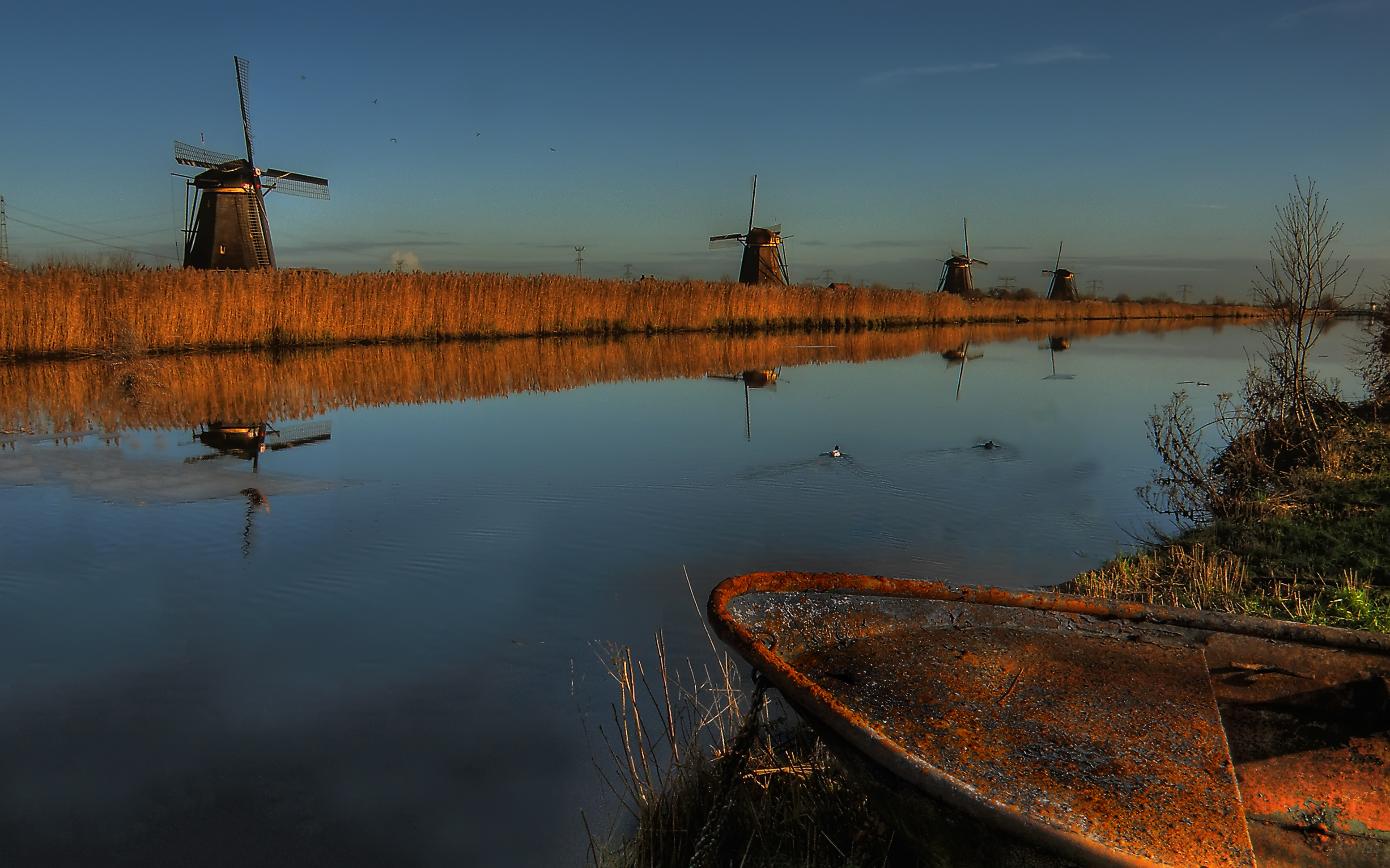 Mooie compositie met de roestige boot in de voorgrond. Ook qua kleuren goed op elkaar afgestemd. Kinderdijk heb ik nog niet voor de camera gehad, toch eens een keer doen š