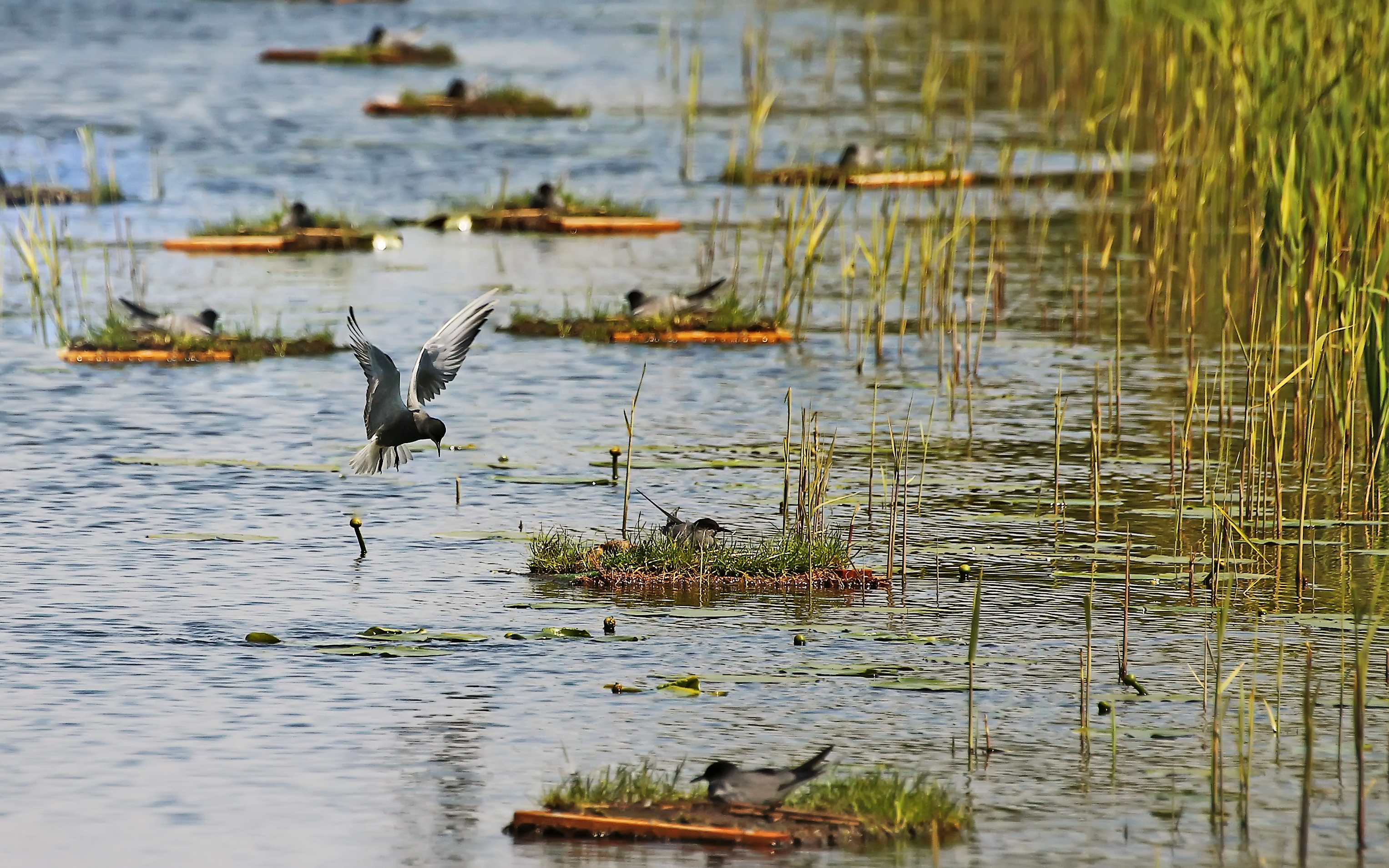 Prachtig, geweldig foto. mooie compositie en wat leuk al die vlotjes waar de vogeltjes op zitten 😉