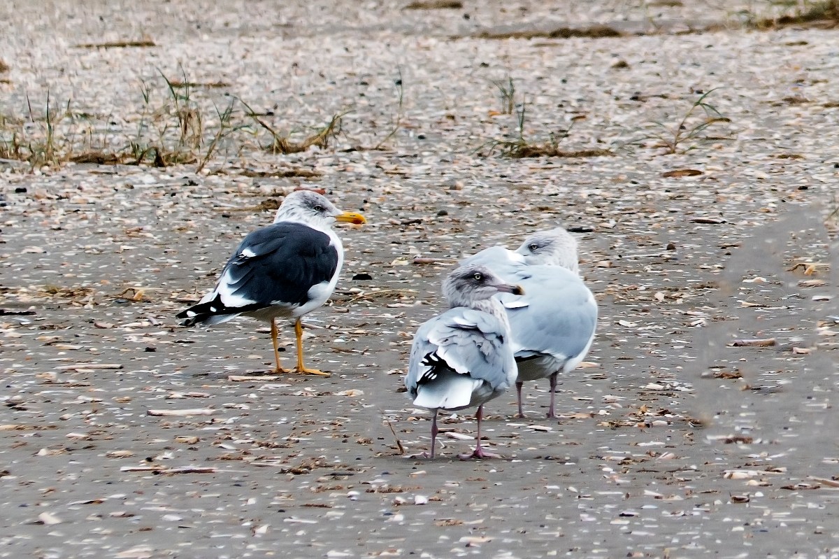 kleine mantelmeeuw (Larus fuscus), met twee jonge zilvermeeuwen