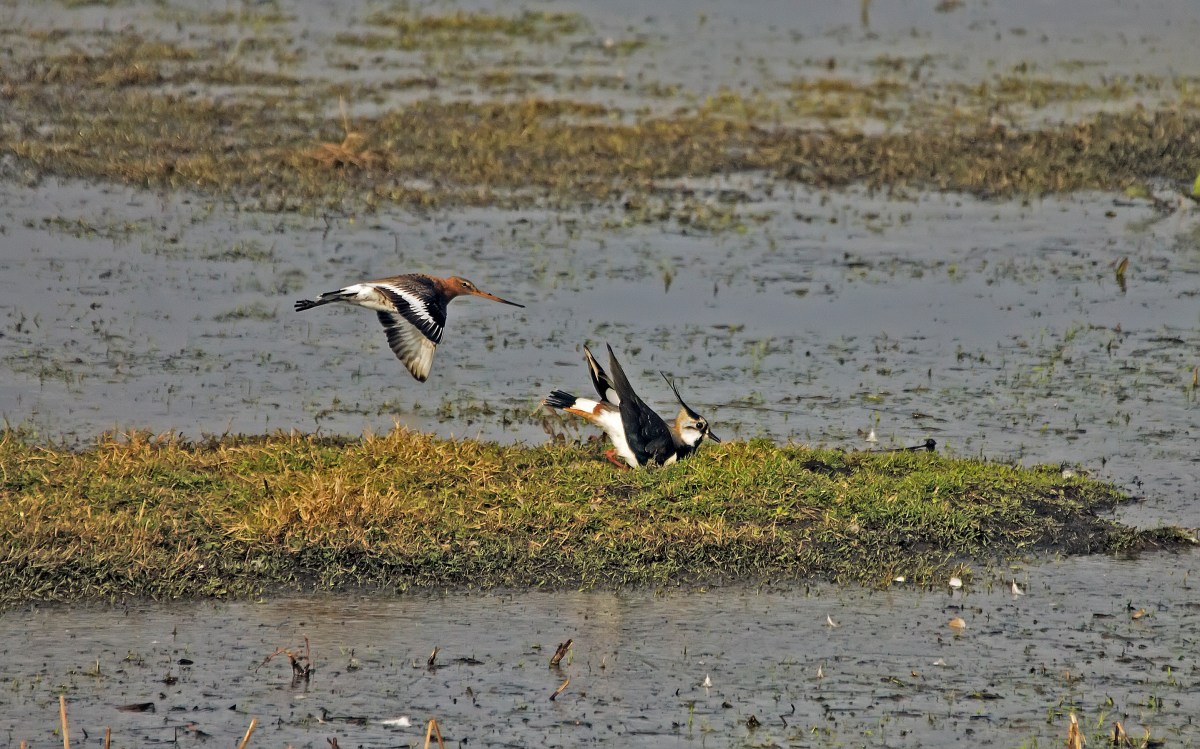 Niet alleen door de licht opgewipte snavel is de rosse grutto van de grutto goed te onderscheiden: ook het vleugelpatroon verschilt. Bij de rosse grutto ontbreekt bijvoorbeeld de brede witte vleugelstreep van de grutto, die op deze foto duidelijk te zien is.