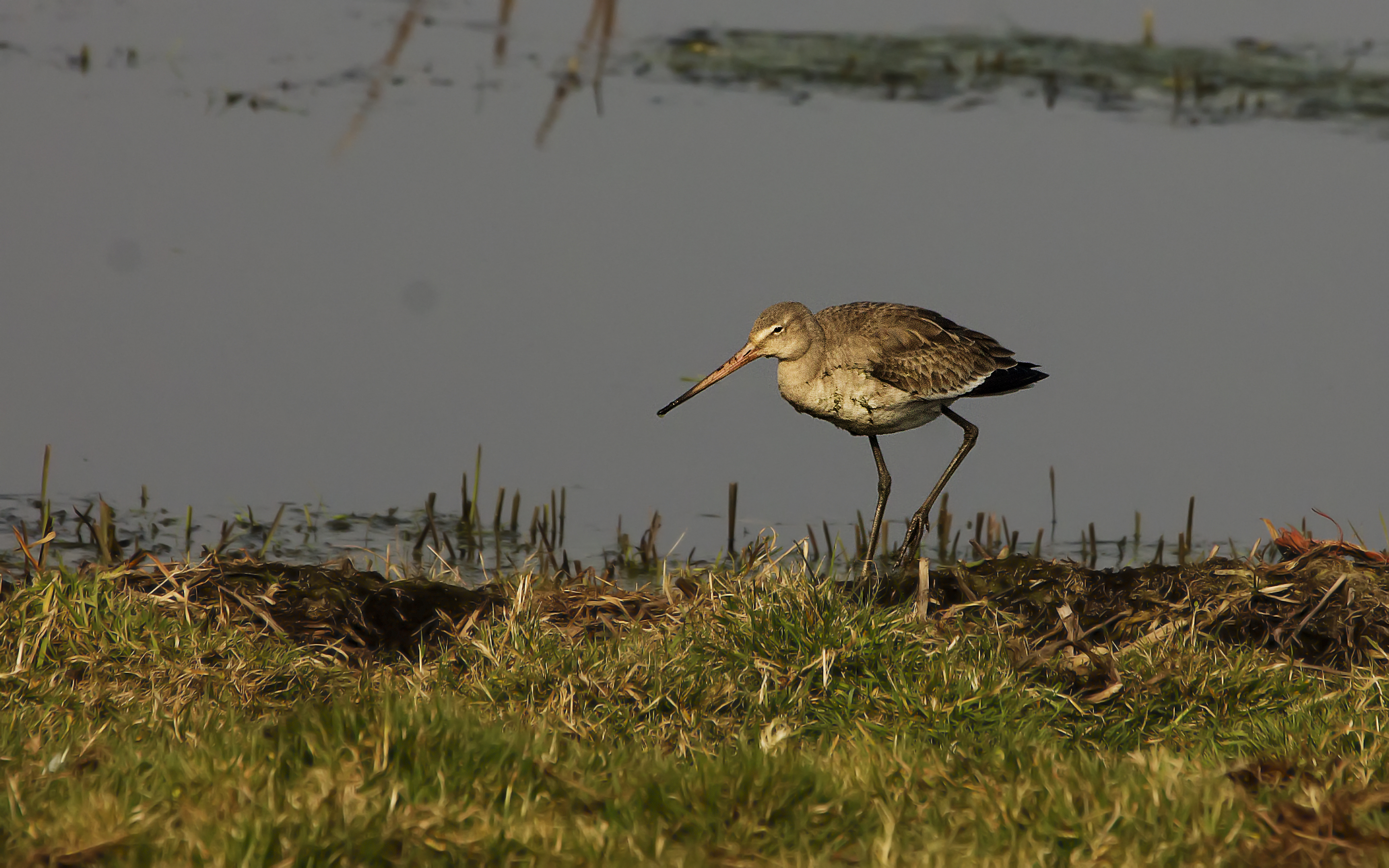 Dit dunkt mij, gelet op de enigszins opgewipte snavel, geen gewone, maar een rosse grutto (Limosa lapponica). Rossig moet hij nog worden, z’n zomerkleed heeft hij nog niet aan.
