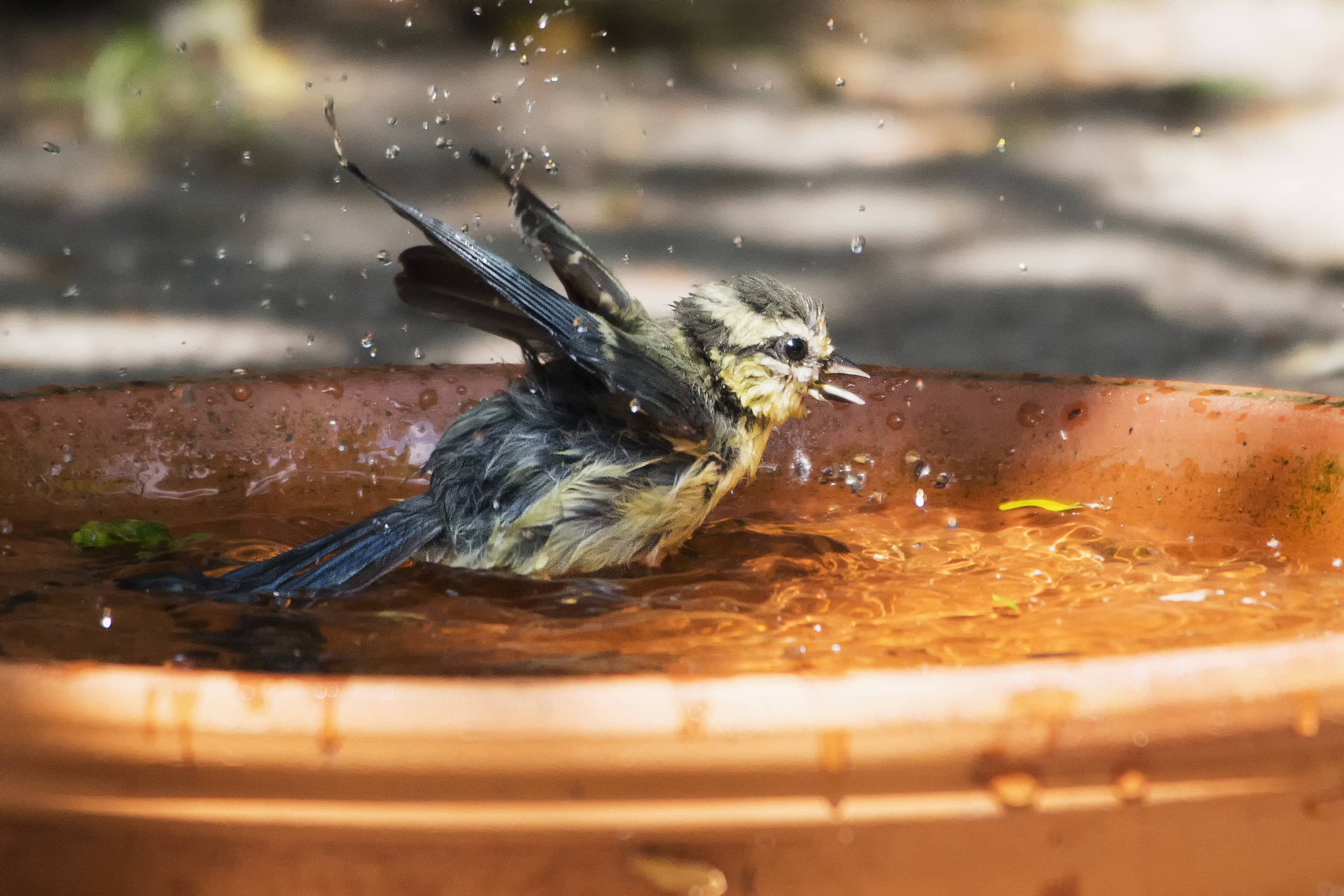 de jonge kool- en pimpelmezen in mijn tuintje maken dankbaar gebruik van de mogelijkheid zo nu en dan even lekker te badderen …