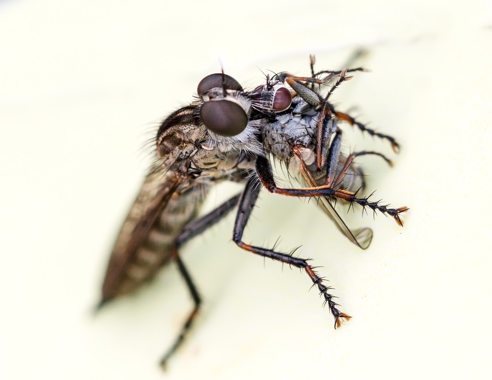 De foto toont een dambordvlieg die door een veel grotere roofvlieg, ik denk Machimus atricapillus, wordt leeggezogen.
