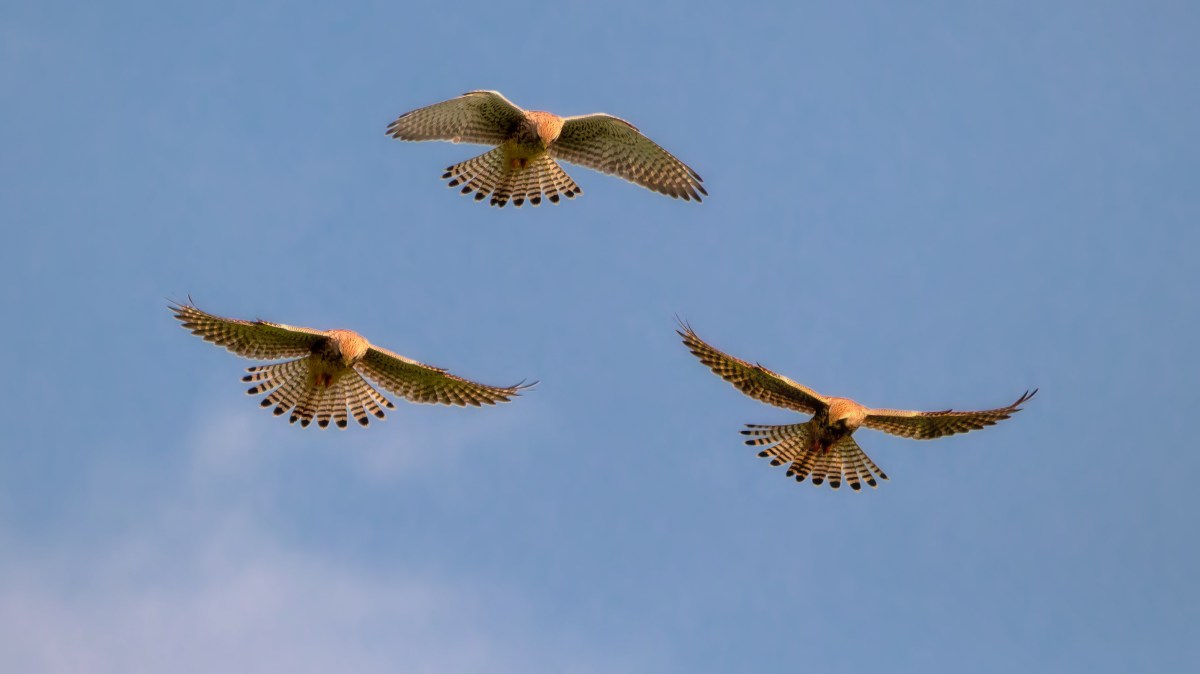 Drie biddende torenvalken op een rij? Dat heb je vast nog nooit gezien! En ik ook niet, trouwens. Ik heb gewoon drie na elkaar genomen opnames synchroon in beeld gezet. Want als ik ze allemaal achter elkaar zet, gaat dat al gauw wat vervelen. Een paar foto’s verderop zal ik het nog een keer doen met twee torenvalken. Zo ben je er lekker snel doorheen, zodat je weer een goed boek kunt gaan lezen š