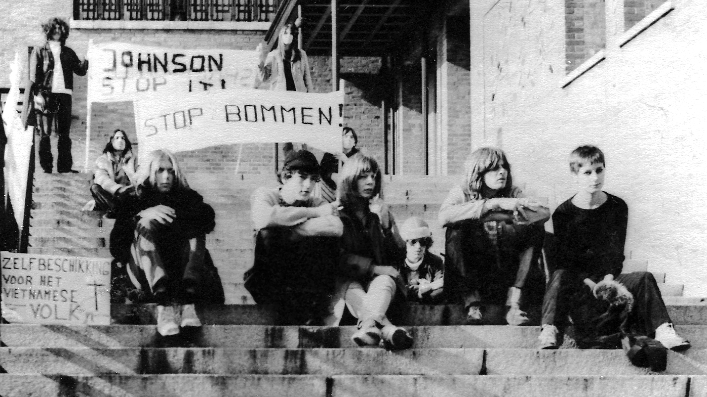 Voorste rij v.l.n.r. onbekend, Pim Vervoort met vriendin Riki, daarachter (met muts) André van der Horst, onbekend, Joke van Munster. Staand rechts achter: Sandra