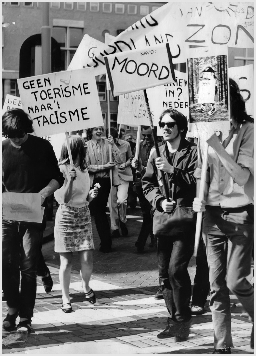 Voor het stadhuis in Hengelo. Waarschijnlijk 1967. Het bord ´Geen toerisme naar ´t facisme´ wordt omhooggehouden door Henriëtte Withaar. Jan Heerdink vindt de Navo MOORD, en rechts van Jan verschuilt Ko Hoogslag zich achter een bord waarop gewaarschuwd wordt tegen het gebruik van vuur in de natuur. Want demonstreren is een serieuze zaak, maar je mag er ook best wel eens de draak mee steken. Ik kan er nog om gniffelen. Met Ko trok ik regelmatig op in de jaren zestig. Helaas pleegde hij later zelfmoord.